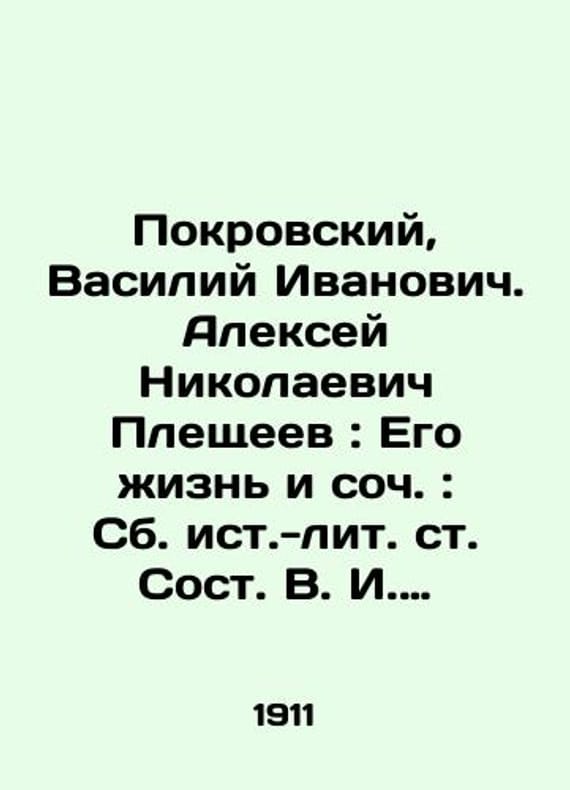 "Pokrovsky, Vasily Ivanovich. Alexey Nikolaevich Pleshchev: His Life and Op. cit. V.I. Pokrovsky, Moscow: 1911.-4, 127 1 p.; 26x17 sm./Pokrovskiy, Vasiliy Ivanovich. Aleksey Nikolaevich Pleshcheev: Ego zhizn i soch.: Sb. ist.-lit. st. Sost. V. I. Pokrovskiy.-Moskva: 1911.-4, 127 1 s.; 26x17 sm. Pokrovsky, Vasily Ivanovich. Alexey Nikolaevich Pleshchev: His Life and Op. cit. V.I. Pokrovsky - Moscow: 1911.-4, 127 1 p.; 26x17 sm.We have thousands of titles and often several copies of each title may be available. Please feel free to contact us for a detailed description of the copies available. SKUbd-d6c5e750d7d1bcc5."