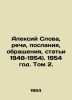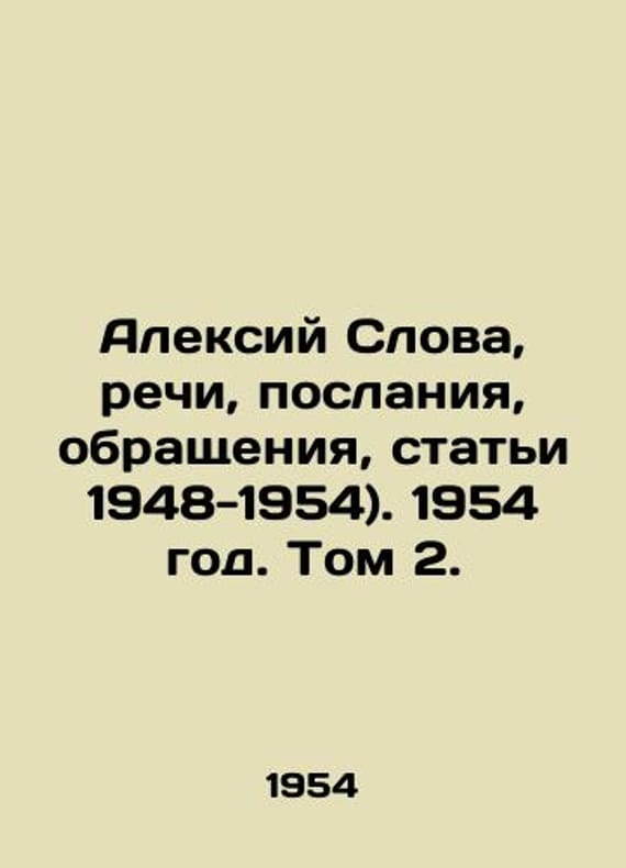 Alexey Words, Speeches, Messages, Appeals, Articles 1948-1954. 1954. Vol. 2./Aleksiy Slova, rechi, poslaniya, obrashcheniya, stati 1948-1954). 1954 god. Tom 2. Edition of the Moscow Patriarchate. Moscow. 1954. Alexey. Patriarch of Moscow and All Russia. His Holinesss writings are located in this publication on historical events in which His Holiness participated in one way or another from April 1948 to May 1954, reflecting at the same time the most important events in the life of the Russian Orthodox Church and our country during this period. We have thousands of titles and often several copies of each title may be available. Please feel free to contact us for a detailed description of the copies available. SKUbd-d912aa6d50e8eef1.