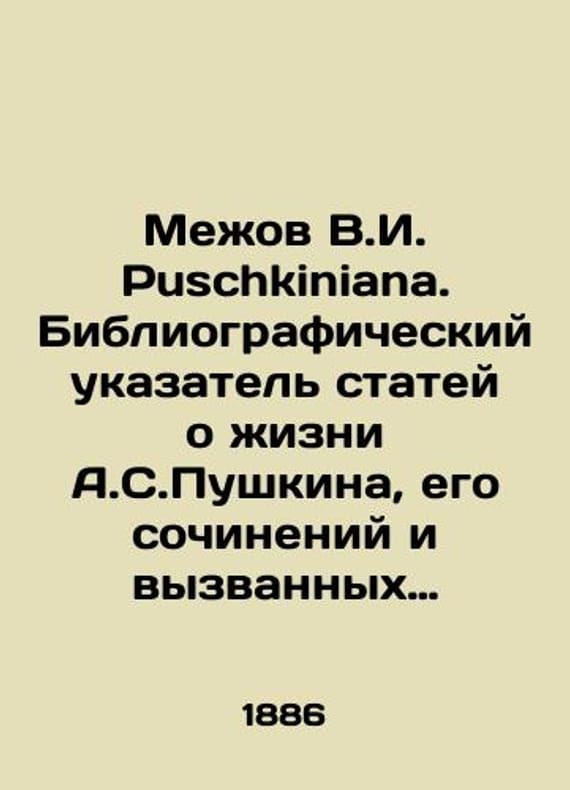 Mezhov V.I. Puschkiniana. Bibliographic index of articles about the life of A.S. Pushkin, his works and works of literature and art caused by them. St. Petersburg. Type V.Bezobrazhov and comp. 1886. 405 p./Mezhov V.I. Puschkiniana. Bibliograficheskiy ukazatel statey o zhizni A.S.Pushkina, ego sochineniy i vyzvannykh imi proizvedeniy literatury i iskusstva. S.Pb.Tip. V.Bezobrazova i komp. 1886 g. 405 s. Mezhov V.I. Puschkiniana. Bibliographic index of articles about the life of A.S. Pushkin, his works and works of literature and art caused by them. St. Petersburg. Type V.Bezobrazhov and comp. 1886. 405 We have thousands of titles and often several copies of each title may be available. Please feel free to contact us for a detailed description of the copies available. SKUbd-d94b5539cba984ba.