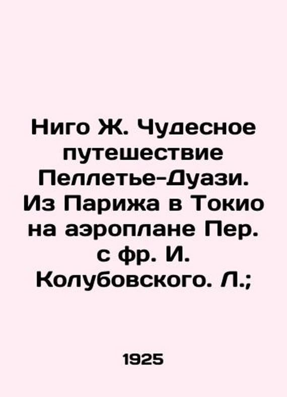 "Nigo J. Pelletier-Doisys Wonderful Journey. From Paris to Tokyo on an Aeroplane Translated from French by I. Kolubovsky. L.;/Nigo Zh. Chudesnoe puteshestvie Pellete-Duazi. Iz Parizha v Tokio na aeroplane Per. s fr. I. Kolubovskogo. L.; Nigo J. The Miraculous Journey of Pelletier-Doisy. From Paris to Tokyo by Aeroplane Translated from I. Kolubovsky. L.; Moscow: Publishing House Petrograd, 1925. 162, 2 We have thousands of titles and often several copies of each title may be available. Please feel free to contact us for a detailed description of the copies available. SKUbd-d97e38b2bbc9e419."