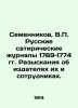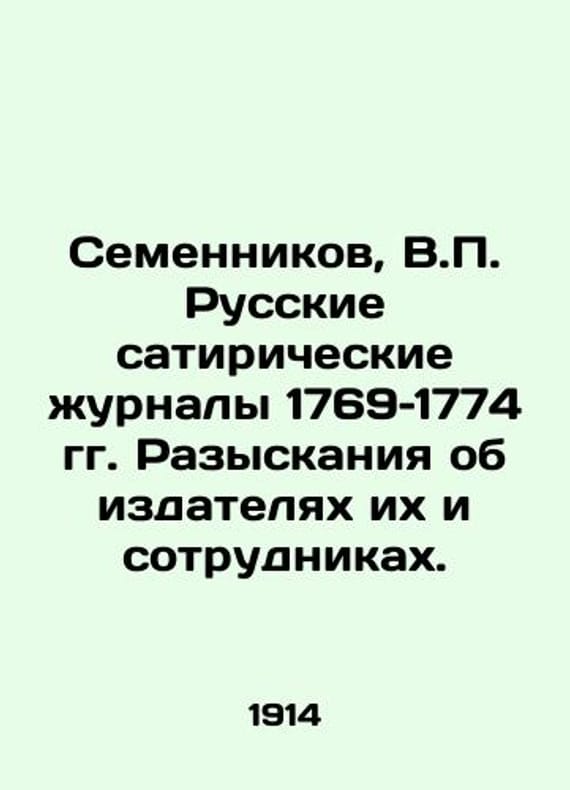 Semennikov, V. Russian satirical magazines 1769-1774. Investigations about their publishers and employees./Semennikov, V. Russkie satiricheskie zhurnaly 1769 1774 gg. Razyskaniya ob izdatelyakh ikh i sotrudnikakh. Semennikov, V. Russian satirical magazines 1769-1774. Investigations about their publishers and employees. St. Petersburg: Sirius Printing House, 1914. We have thousands of titles and often several copies of each title may be available. Please feel free to contact us for a detailed description of the copies available. SKUbd-d98c32f776720e2f.