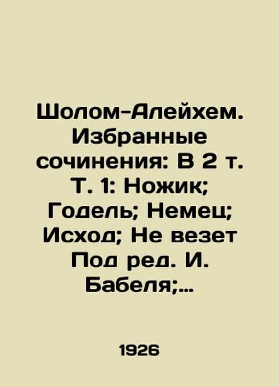 "Sholom-Aleichem. Selected Works: In 2 Vol. Vol. 1: Knife; Godel; German; Exodus; Under the editorship of I. Babel; Translated from the Hebrew by S. Hecht./Sholom-Aleykhem. Izbrannye sochineniya: V 2 t. T. 1: Nozhik; Godel; Nemets; Iskhod; Ne vezet Pod red. I. Babelya; Per. s evr. S. Gekhta. Sholom-Aleichem. Selected works: In 2 Vol. 1: Knife; Godel; German; Exodus; Not lucky Under the editorship of I. Babel; Translated from Hebrew by S. Gecht. M.; L.: Land and Factory, 1926.-Vol. 1-168 p.;. We have thousands of titles and often several copies of each title may be available. Please feel free to contact us for a detailed description of the copies available. SKUbd-dbdb44d430cb576a."