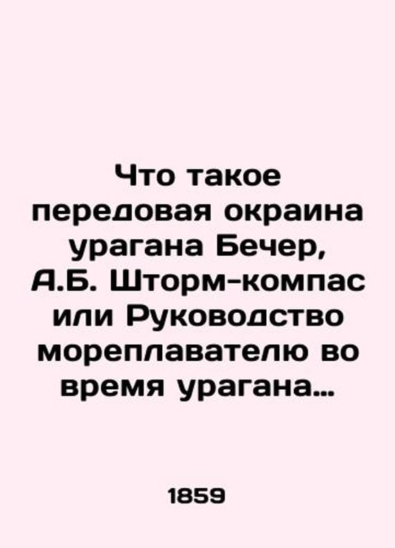 What is the frontline of Hurricane Becher, the A.B. Storm Compass, or the Navigators Guide during Hurricane A.B. Becher?/Chto takoe peredovaya okraina uragana Becher, A.B. Shtorm-kompas ili Rukovodstvo moreplavatelyu vo vremya uragana sost. A.B. Becher, per. s angl. S. Samokhvalov. A.B. Becher, Translated from English by S. Samokhvalov. St. Petersburg: Type. Maritime Ministry, 1859. 2, 49 p., 1 l.: 22,9 - 15,4 sm. We have thousands of titles and often several copies of each title may be available. Please feel free to contact us for a detailed description of the copies available. SKUbd-dcc34877ecf97afb.