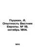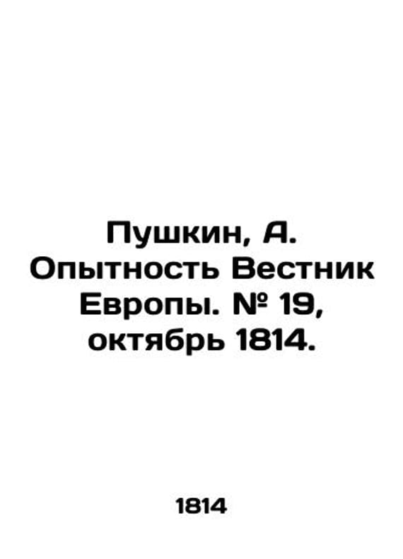 Pushkin, A. Experience Bulletin of Europe. # 19, October 1814./Pushkin, A. Opytnost Vestnik Evropy. # 19, oktyabr 1814. Pushkin, A. Experience Bulletin of Europe. # 19, October 1814. Moscow: In the University Type., 1814. 165-244 p. 21,5 - 13,5 sm.. SKUbd-dcd7343fc4151f01.We have thousands of titles and often several copies of each title may be available. Please feel free to contact us for a detailed description of the copies available. The delivery of this book might be delayed beyond the usual time due to extended processing and preparation before shipment, and faster shipping options are not offered. Please inform us if you need the order by a certain date or have a deadline.SKUbd-dcd7343fc4151f01