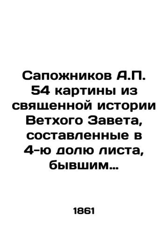 Bopozhnikov A. 54 paintings from the sacred history of the Old Testament, compiled in the 4th fraction of a leaf, by former professor of the Imperial Academy of Arts, Bopozhnikov/Sapozhnikov A. 54 kartiny iz svyashchennoy istorii Vetkhogo Zaveta, sostavlennye v 4-yu dolyu lista, byvshim professorom Imperatorskoy Akademii khudozhestv, Sapozhnikovym. Poyasneniya k kartinam, imeyushchie polnuyu istoricheskuyu svyaz, napisany V. Zolotovym. Bopozhnikov A. 54 paintings from the sacred history of the Old Testament, compiled in the 4th fraction of a leaf, by a former professor of the Imperial Academy of Arts, Bopozhnikov.We have thousands of titles and often several copies of each title may be available. Please feel free to contact us for a detailed description of the copies available. SKUbd-dd8fbf63dfc62b63.