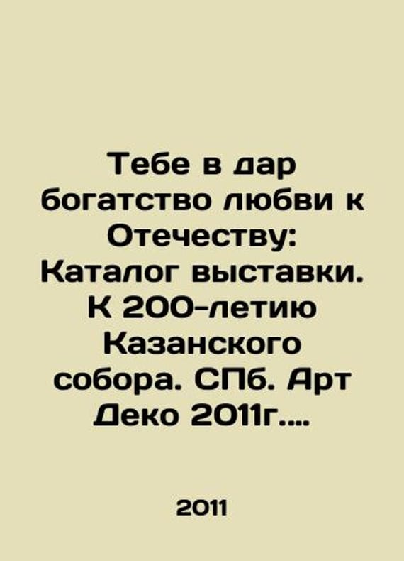 To you as a gift the richness of love for the Fatherland: Exhibition Catalogue. To the 200th Anniversary of the Kazan Cathedral. St. Petersburg Art Deco 2011. 184s./Tebe v dar bogatstvo lyubvi k Otechestvu: Katalog vystavki. K 200-letiyu Kazanskogo sobora. S.Pb.Art Deko 2011g. 184s. To you as a gift the richness of love for the Fatherland: Exhibition Catalogue. To the 200th Anniversary of the Kazan Cathedral. St. Petersburg Art Deco 2011. 184s. We have thousands of titles and often several copies of each title may be available. Please feel free to contact us for a detailed description of the copies available. SKUbd-dd9c3769da670561.
