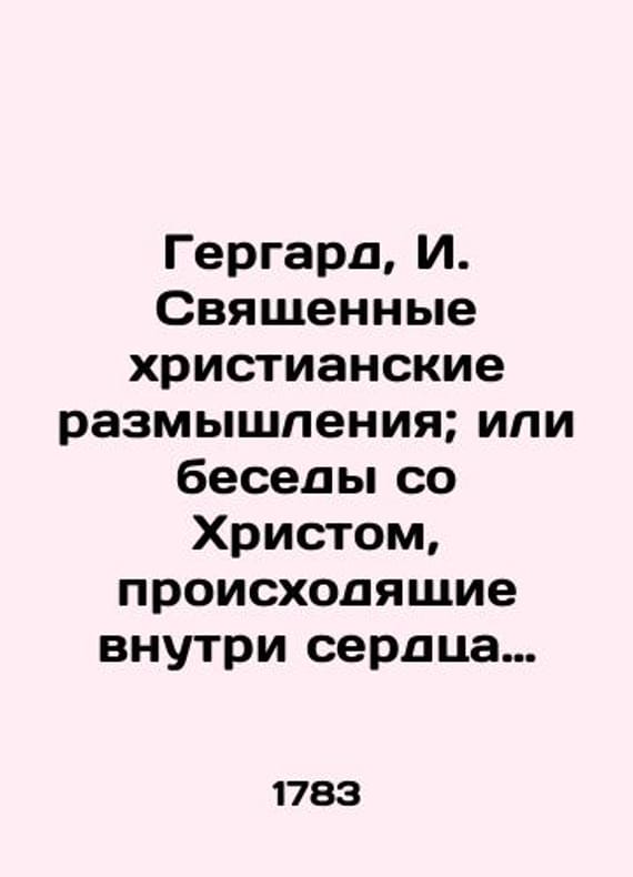 "Gergard, I. Sacred Christian reflections; or conversations with Christ taking place within the heart of a pious Christian; Serving to spread true piety and revive the inner spiritual invisible man./Gergard, I. Svyashchennye khristianskie razmyshleniya; ili besedy so Khristom, proiskhodyashchie vnutri serdtsa blagochestivogo khristianina; Sluzhashchaya k rasprostraneniyu istinnogo blagochestiya i vozrozhdeniyu vnutrennego dukhovnogo nevidimogo cheloveka. Gergard, I. Sacred Christian reflections; or conversations with Christ occurring within the heart of a pious Christian; Serving to spread true piety and revive the inner spiritual invisible man. Moscow: In the University Printing House, N. Novikov, 1783. 14, 334 p.We have thousands of titles and often several copies of each title may be available. Please feel free to contact us for a detailed description of the copies available. SKUbd-deeb13914ec852b9."