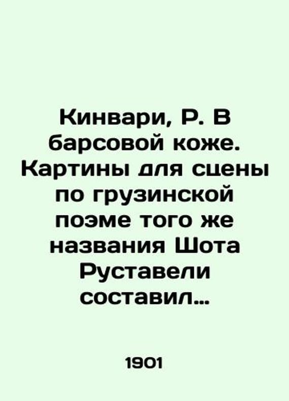 Kinvari, R. In leopard skin. Paintings for the stage based on a Georgian poem of the same name by Shota Rustaveli were made by R. Kinvari./Kinvari, R. V barsovoy kozhe. Kartiny dlya stseny po gruzinskoy poeme togo zhe nazvaniya Shota Rustaveli sostavil R. Kinvari. Kinvari, R. In leopard skin. Paintings for the stage based on a Georgian poem of the same name by Shota Rustaveli were made by R. Kinvari. St. Petersburg: Type A.S. Suvorin, 1901.We have thousands of titles and often several copies of each title may be available. Please feel free to contact us for a detailed description of the copies available. SKUbd-dfd3c187acdd0670.