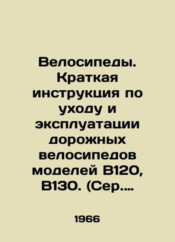 Bicycles. Brief instructions for the care and operation of road bicycles of models B120, B130. (Bicycles of Kharkiv Bicycle Plant)/Velosipedy. Kratkaya instruktsiya po ukhodu i ekspluatatsii dorozhnykh velosipedov modeley V120, V130. (Ser. Velosipedy Kharkovskogo velozavoda) Kharkiv, prapor, 1966.We have thousands of titles and often several copies of each title may be available. Please feel free to contact us for a detailed description of the copies available. SKUbd-e035450e705d1728.