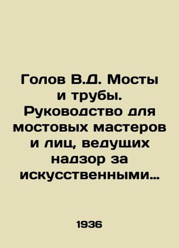 Golov V.D. Bridges and pipes. Guide for bridge masters and persons supervising artificial structures. -, edited and edited by Eng. I. N. Nikonov./Golov V.D. Mosty i truby. Rukovodstvo dlya mostovykh masterov i lits, vedushchikh nadzor za iskusstvennymi sooruzheniyami.-, ispr. i otred. inzh. I. N. Nikonov. M.: Transjeldorizdat, 1936. 368 p.: il.We have thousands of titles and often several copies of each title may be available. Please feel free to contact us for a detailed description of the copies available. SKUbd-e13dc7d5e599a09e.