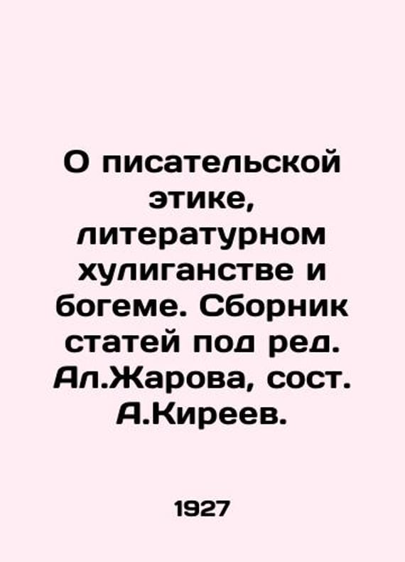 On Writers Ethics, Literary Hooliganism and Bohemia. A collection of articles edited by Al.Zharov, composed by A.Kireyev. /O pisatelskoy etike, literaturnom khuliganstve i bogeme. Sbornik statey pod red. Al.Zharova, sost. A.Kireev. L.: Priboy, 1927.We have thousands of titles and often several copies of each title may be available. Please feel free to contact us for a detailed description of the copies available. SKUbd-e1c9ce2cde137855.