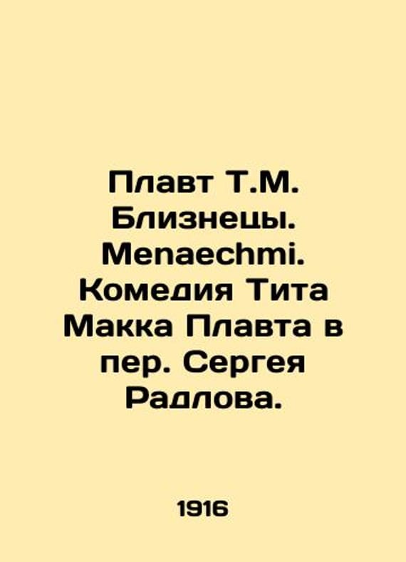 "T.M. Twins float. Menaechmi. Titus Mack Plavts comedy, translated by Sergei Radlov./Plavt T.M. Bliznetsy. Menaechmi. Komediya Tita Makka Plavta v per. Sergeya Radlova. T.M. Twins float. Menaechmi. Titus Mack Plavts comedy, translated by Sergei Radlov. Pg.: Love for Three Oranges, 1916. 116 p.; 20.9 - 13.5 cm. We have thousands of titles and often several copies of each title may be available. Please feel free to contact us for a detailed description of the copies available. SKUbd-e1e38219d4558e62."