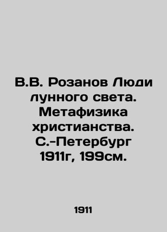 V.V. Rozanov The People of Moonlight. Metaphysics of Christianity. St. Petersburg 1911, 199sm./V.V. Rozanov Lyudi lunnogo sveta. Metafizika khristianstva. S.-Peterburg 1911g, 199sm. V.V. Rozanov The People of Moonlight. Metaphysics of Christianity. St. Petersburg 1911, 199sm. We have thousands of titles and often several copies of each title may be available. Please feel free to contact us for a detailed description of the copies available. SKUbd-e26b1af7eda0579b.