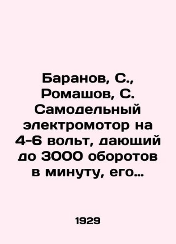 Baranov, S., Romashov, S. Self-made electric motor of 4-6 volts, giving up to 3000 revolutions per minute, its applications and experiments with it. With 41 figures./Baranov, S., Romashov, S. Samodelnyy elektromotor na 4-6 volt, dayushchiy do 3000 oborotov v minutu, ego primeneniya i opyty s nim. S 41 risunkom. Baranov, S., Romashov, S. Self-made electric motor of 4-6 volts, giving up to 3000 revolutions per minute, its application and experiments with it. With 41 drawings. 3rd ed. L.: Scientific book publishing house, 1929. 40 p.: il. 17 - 13 sm. We have thousands of titles and often several copies of each title may be available. Please feel free to contact us for a detailed description of the copies available. SKUbd-eddcf28addd46af1.