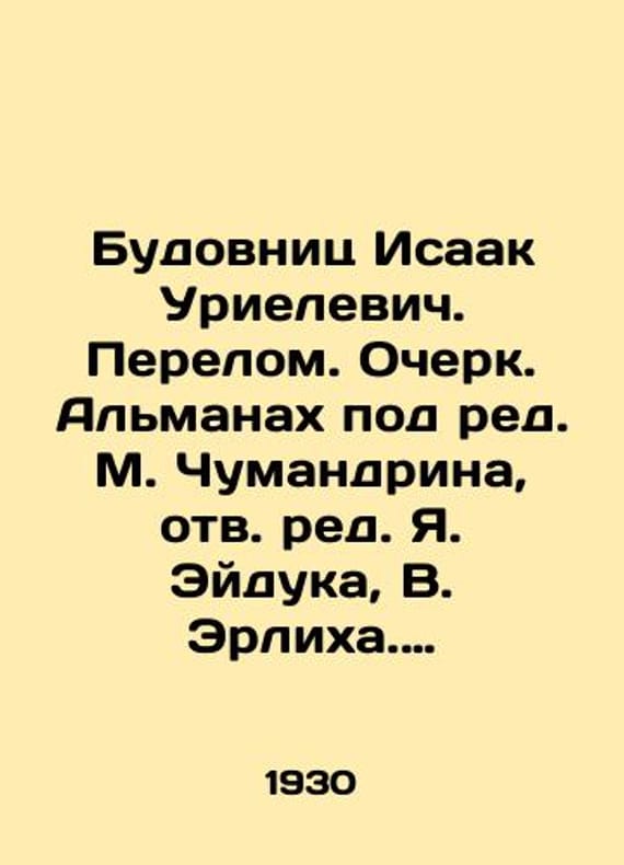 Budownitz Isaac Urielevich. The Break. Essay. The Almanac, edited by M. Chumandrin, edited by Ya. Eiduk, V. Ehrlich. 1930./Budovnits Isaak Urielevich. Perelom. Ocherk. Almanakh pod red. M. Chumandrina, otv. red. Ya. Eyduka, V. Erlikha. 1930. Budownitz Isaac Urielevich (1897-1963). Breakdown. Essay. Almanac, edited by M. Chumandrin, edited by Ya. Eiduk, V. Ehrlich. Appendix to the magazine Stroyka. Leningrad. Printing House of Krasnaya Gazeta. 1930. 122 pages.We have thousands of titles and often several copies of each title may be available. Please feel free to contact us for a detailed description of the copies available. SKUbd-816f591808e8e39d.