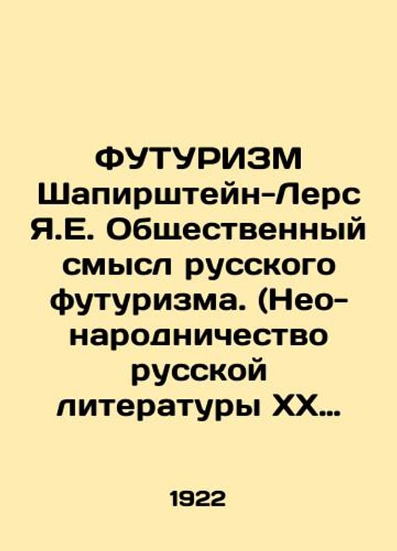 FUTURISM Shapyrstein-Lers Ya.E. The Public Meaning of Russian Futurism. (Neo-Nationalism of Russian Literature of the 20th Century). 1922./FUTURIZM Shapirshteyn-Lers Ya.E. Obshchestvennyy smysl russkogo futurizma. (Neo-narodnichestvo russkoy literatury KhKh veka ). 1922. Shapyrshtein-Lers Ya.E. The Public Meaning of Russian Futurism. (Neo-Nationalism of Russian Literature of the XX Century). Preface by A.V. Lunacharsky. Moscow, 1922. 78 pages.We have thousands of titles and often several copies of each title may be available. Please feel free to contact us for a detailed description of the copies available. SKUbd-b6dd8e03279db2d0.
