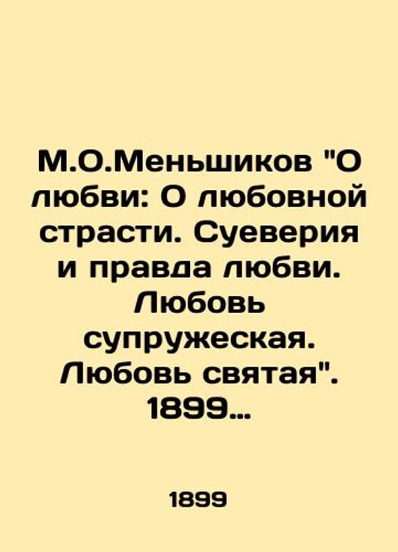 M.O.Menshikov On Love: On Love Passion. Superstition and Truth of Love. Matrimonial Love. Holy Love. 1899./M.O.Menshikov O lyubvi: O lyubovnoy strasti. Sueveriya i pravda lyubvi. Lyubov supruzheskaya. Lyubov svyataya. 1899 god. Love in the alchemy of happiness is the philosophical stone whose touch on the most despicable things gives them the price of gold. Like an elecsir in life, love brings back the fire of youth to our dead attitude to things. And in the days of upheaval of 1917-1918, after one of the leaders of the revolution mischaracterized the label faithful dog of the tsars black hundred, the logical and tragic continuation was the lead polygraph that pierced the heart of a journalist when he was shot without trial on September 20, 1918, on the shore of Lake Valdai, in broad daylight, almost before the eyes of terrified waldasha and six young children of M.O. Menshikov..We have thousands of titles and often several copies of each title may be available. Please feel free to contact us for a detailed description of the copies available. The delivery of this book might be delayed beyond the usual timeframe due to extended processing and preparation before shipment, and faster shipping options are not offered. Please inform us if you need the order by a certain date or have a deadline.SKUbd-ef9b711b2ed3ef43