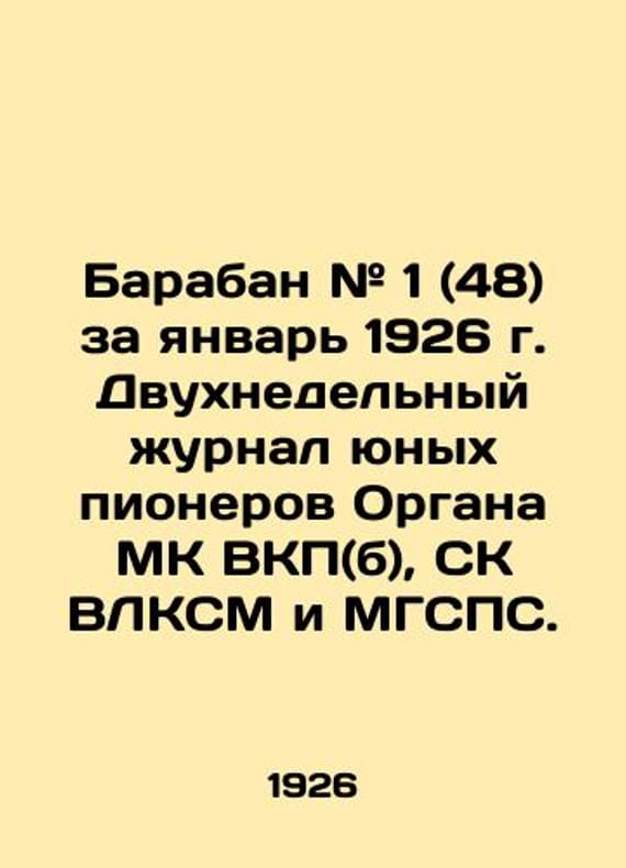 "Drum # 1 (48) for January 1926. A two-week journal of young pioneers of the organ of MK, VKSM and MSPS./Baraban # 1 (48) za yanvar 1926 g. Dvukhnedelnyy zhurnal yunykh pionerov Organa MK VKP(b), SK VLKSM i MGSPS. Drum # 1 (48) for January 1926. Two-week journal of young pioneers of the organ of MK, VKSM and MSPS. Moscow: 1926. 24 p., silt; 31x23 sm.We have thousands of titles and often several copies of each title may be available. Please feel free to contact us for a detailed description of the copies available. SKUbd-f026a06ef7ad18ee."