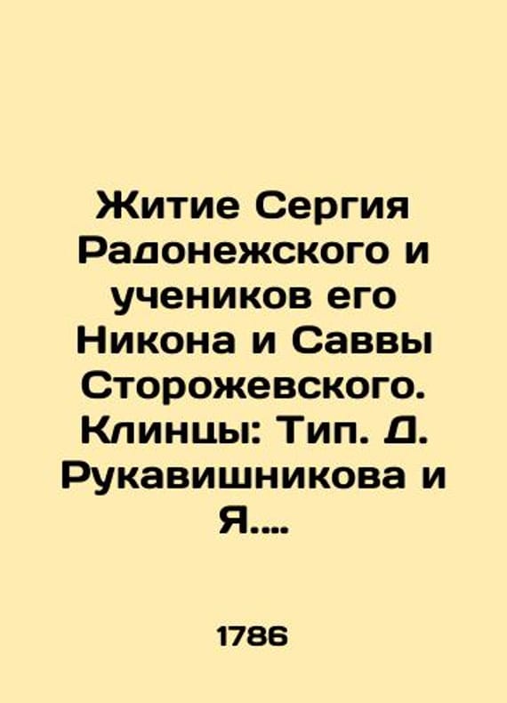 The life of Sergius Radonezh and his disciples Nikon and Savva Storozhevsky. Clints: Type D. Rukavishnikov and Ya. Zheleznikov, 18 July 1786./Zhitie Sergiya Radonezhskogo i uchenikov ego Nikona i Savvy Storozhevskogo. Klintsy: Tip. D. Rukavishnikova i Ya. Zheleznikova, 18 iyulya 1786. The life of Sergius Radonezh and his disciples Nikon and Savva Storozhevsky. Clints: Type D. Rukavishnikov and Ya. Zheleznikov, 18 July 1786. We have thousands of titles and often several copies of each title may be available. Please feel free to contact us for a detailed description of the copies available. SKUbd-f06cb7095dda25c4.