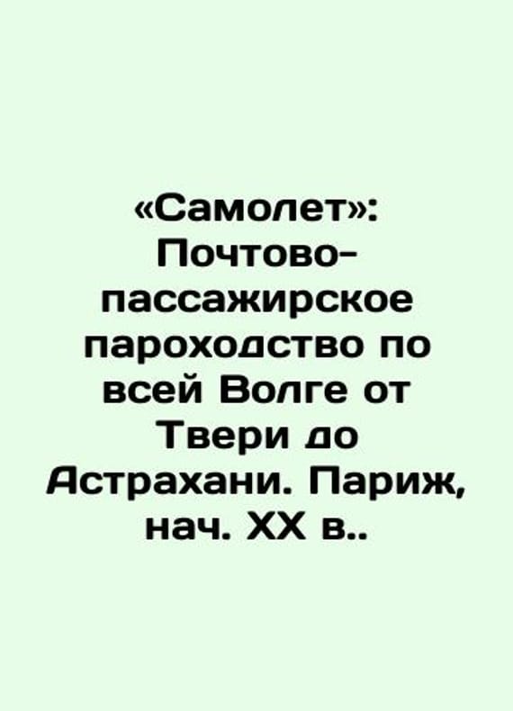 Plane: Postal and passenger shipping all over the Volga from Tver to Astrakhan. Paris, early 20th century. /«Samolet: Pochtovo-passazhirskoe parokhodstvo po vsey Volge ot Tveri do Astrakhani. Parizh, nach. KhKh v. Paris: Printed by S. Sluchansky and Son, early 20th century, 62 l. 18x26,5 sm.We have thousands of titles and often several copies of each title may be available. Please feel free to contact us for a detailed description of the copies available. SKUbd-f1e312f2eb5e4cc0.