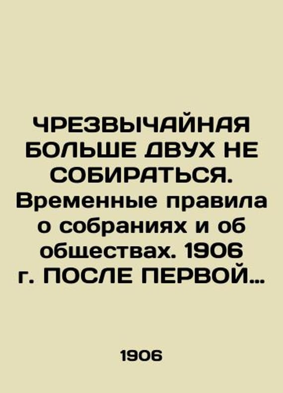 EMERGENCY BY TWO. Provisional Rules on Meetings and Societies. 1906 AFTER THE FIRST RUSSIAN REVOLUTION./ChREZVYChAYNAYa BOLShE DVUKh NE SOBIRATSYa. Vremennye pravila o sobraniyakh i ob obshchestvakh. 1906 g. POSLE PERVOY RUSSKOY REVOLYuTsII. M. Publication of the Central Committee of the Constitutional-Democratic Party (Peoples Freedom Party), 1906, 20We have thousands of titles and often several copies of each title may be available. Please feel free to contact us for a detailed description of the copies available. SKUbd-f498ca2c4d13ff81.