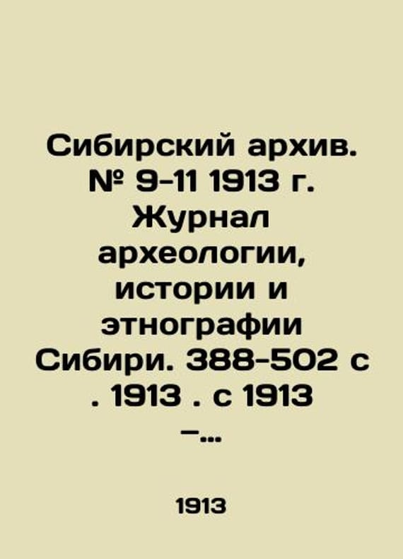 "Siberian Archives. # 9-11 1913 Journal of Archaeology, History, and Ethnography of Siberia. 388-502 p. 1913. 1913 Journal of History, Archaeology, Geography, and Ethnography of Siberia, Central Asia, and the Far East; 1916, after the word"" ethnography, ""adding: cultures and the public... Irkutsk; # 12 1913-1915 Minusinsk (Yeniseisk Lib.). 1911-1916/Sibirskiy arkhiv. # 9-11 1913 g. Zhurnal arkheologii, istorii i etnografii Sibiri. 388-502 s . 1913 . s 1913 Zhurnal istorii, arkheologii, geografii i etnografii Sibiri, Sredney Azii i Dalnego Vostoka; v 1916 posle slova «etnografii dobav.: kultury i obshchestvennosti... Irkutsk; s # 12 1913 po 1915 Minusinsk (Eniseysk. gub.). 1911 1916. Ezhemes. Siberian Archives. # 9-11 1913 Journal of Archaeology, History, and Ethnography of Siberia. 388-502 p. 1913. 1913 Journal of History, Archaeology, Geography, and Ethnography of Siberia, Central Asia, and the Far East; 1916, after the word"" ethnography, ""adding: cultures and the public... Irkutsk; # 12 1913-1915 Minusinsk (Yeniseisk Lib.). 1911-1916. SKUbd-f6b4db17e3cb7f7a.We have thousands of titles and often several copies of each title may be available. Please feel free to contact us for a detailed description of the copies available. The delivery of this book might be delayed beyond the usual time due to extended processing and preparation before shipment, and faster shipping options are not offered. Please inform us if you need the order by a certain date or have a deadline.SKUbd-f6b4db17e3cb7f7a"