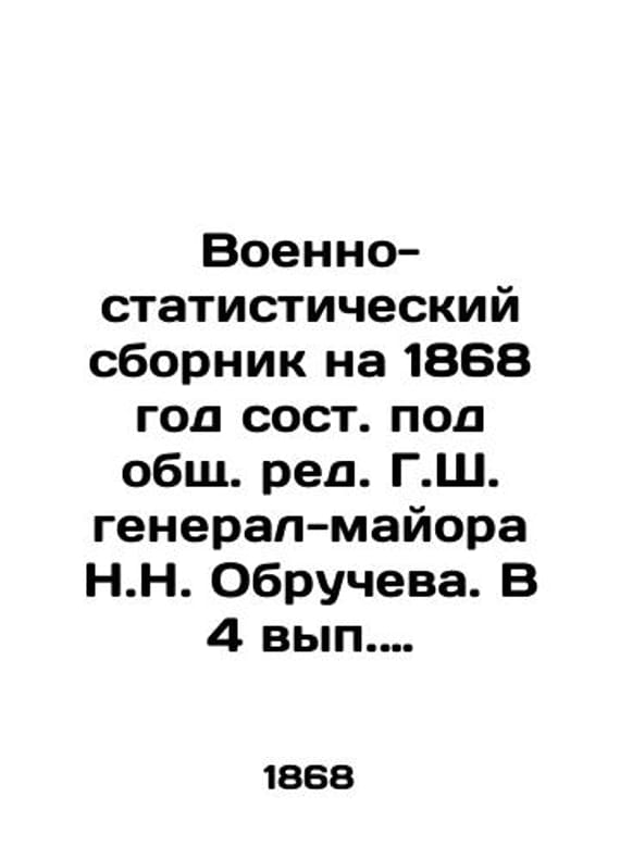 Military-statistical compendium for 1868, compiled under the general editorship of Major-General N.N. Obruchev. In 4 volume 3. Persia, Avganistan, Baluchistan, Central Asian holdings, Japan, North American United States, Mexico, Brazil and the republics of Cernei and South America. St. Petersburg, 1868./Voenno-statisticheskiy sbornik na 1868 god sost. pod obshch. red. G.Sh. general-mayora N.N. Obrucheva. V 4 vyp. Vyp. 3. Persiya, Avganistan, Beludzhistan, Sredne-Aziatskie vladeniya, Yaponiya, Severo-Amerikanskie Soedinennye shtaty, Meksika, Braziliya i respubliki Serney i Yuzhnoy Ameriki. S.Pb. 1868. Military-statistical compendium for 1868, compiled under the general editorship of Major-General N.N. Obruchev. In 4 volume 3. Persia, Avganistan, Baluchistan, Central Asian holdings, Japan, North American United States, Mexico, Brazil and the republics of Cernei and South America. St. Petersburg, 1868. We have thousands of titles and often several copies of each title may be available. Please feel free to contact us for a detailed description of the copies available. The delivery of this book might be delayed beyond the usual timeframe due to extended processing and preparation before shipment, and faster shipping options are not offered. Please inform us if you need the order by a certain date or have a deadline.SKUbd-f7bfb1dd0e750c46