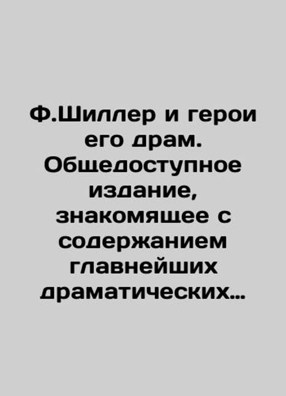 F.Shiller and the heroes of his dramas. A publicly available publication introducing the content of the most important dramatic works of F.Shiller/F.Shiller i geroi ego dram. Obshchedostupnoe izdanie, znakomyashchee s soderzhaniem glavneyshikh dramaticheskikh proizvedeniy F.Shillera. b.g. g. F.Shiller and the heroes of his dramas. A publicly available publication introducing the content of the most important dramatic works of F.Shiller. St. Petersburg: 132 p. We have thousands of titles and often several copies of each title may be available. Please feel free to contact us for a detailed description of the copies available. SKUbd-f862ef9995fa4fd3.