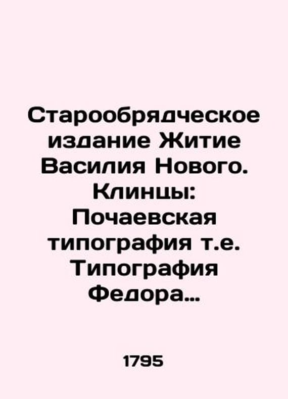 Old Believer Edition The Life of Vasily Novy. Klintsy: Pochaev Printing House i.e. Fyodor Kartashev Typography, 179/Staroobryadcheskoe izdanie Zhitie Vasiliya Novogo. Klintsy: Pochaevskaya tipografiya t.e. Tipografiya Fedora Kartasheva, 179 Old Believer Edition The Life of Vasily Novy. Klintsy: Pochaev Printing House i.e. Fedor Kartashev Typography, 1795. 164 l. 4. We have thousands of titles and often several copies of each title may be available. Please feel free to contact us for a detailed description of the copies available. SKUbd-fbd9ccb8f73da3a2.