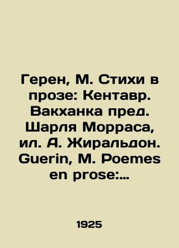 "Guerin, M. Poemes en prose: Le Centaure. La Bacchante preface de Ch. Maurras, S.Pb.de A. Giraldon. In French: Plon Nourrit & Cie, 19/Geren, M. Stikhi v proze: Kentavr. Vakkhanka pred. Sharlya Morrasa, il. A. Zhiraldon. Guerin, M. Poemes en prose: Le Centaure. La Bacchante preface de Ch. Maurras, S.Pb.de A. Giraldon. Na fr. yaz. Parizh: Plon Nourrit & Cie, 19 Guerin, M. Poemes en prose: Le Centaure. La Bacchante preface de Ch. Maurras, S.Pb.de A. Giraldon. Paris: Plon Nourrit & Cie, 1925. 4, 61, 7 p.; 55 We have thousands of titles and often several copies of each title may be available. Please feel free to contact us for a detailed description of the copies available. SKUbd-fc480b4cbf428a9."