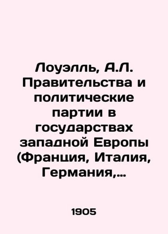 "Lowell, A.L. Governments and political parties in Western European states (France, Italy, Germany, Austria-Hungary, Switzerland)./Louell, A.L. Pravitelstva i politicheskie partii v gosudarstvakh zapadnoy Evropy (Frantsiya, Italiya, Germaniya, Avstro-Vengriya, Shveytsariya) per. s angl. O. Poltoratskoy; red. F. Smirnova. Lowell, A.L. Governments and Political Parties in Western European States (France, Italy, Germany, Austria-Hungary, Switzerland) translated from English by O. Poltoratskaya; edited by F. Smirnov. Moscow: Publishing House of S. Skirmunt, 1905. VIII, 644 p. We have thousands of titles and often several copies of each title may be available. Please feel free to contact us for a detailed description of the copies available. SKUbd-fd5943945d7ec2cb."