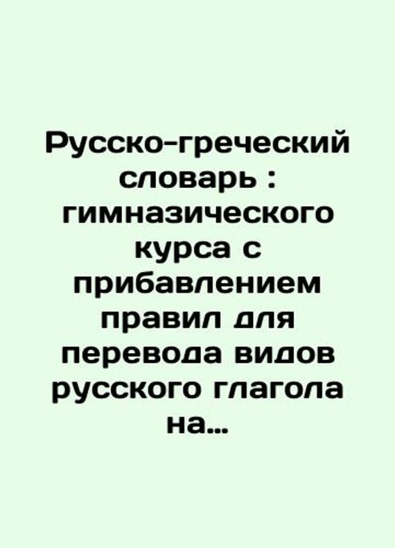 Russian-Greek Dictionary: a gymnasium course with the addition of rules for translating Russian verbs into Greek and a concise Latin-Greek dictionary Compiled by E. Cherny (teacher of ancient languages at the 3rd Moscow Gymnasium)/Russko-grecheskiy slovar: gimnazicheskogo kursa s pribavleniem pravil dlya perevoda vidov russkogo glagola na grecheskiy yazyk i kratkogo latino-grecheskogo slovarya Sostavil E. Chernyy (prepodavatel drevnikh yazykov pri 3-y moskovskoy gimnazii) Russian-Greek Dictionary: a gymnasium course with the addition of rules for translating Russian verbs into Greek and a concise Latin-Greek dictionary Compiled by E. Cherny (teacher of ancient languages at the 3rd Moscow Gymnasium).We have thousands of titles and often several copies of each title may be available. Please feel free to contact us for a detailed description of the copies available. SKUbd-ff422fef89d7dcc.