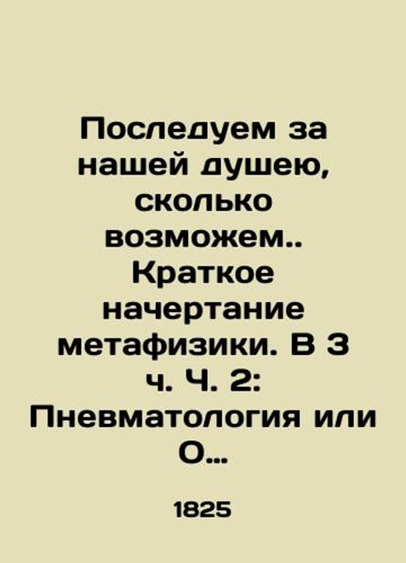 Follow our souls as much as we can.. A brief outline of metaphysics. In Part 3 of Part 2: Pneumology or On sentient and thinking beings. In three parts./Posleduem za nashey dusheyu, skolko vozmozhem. Kratkoe nachertanie metafiziki. V 3 ch. Ch. 2: Pnevmatologiya ili O sushchestvakh chuvstvuyushchikh i myslyashchikh. V trekh chastyakh. Let us follow our souls as much as we can.. A brief outline of metaphysics. In Part 2, Part 3: Pneumology or Creatures Sensing and Thinking. In three parts. St. Petersburg: Ioannesov Type, 1825. 4, IV, 397, 5 p. 20.8 - 12.5 sm.We have thousands of titles and often several copies of each title may be available. Please feel free to contact us for a detailed description of the copies available. SKUbd-ffab412d8b7b8bcf.