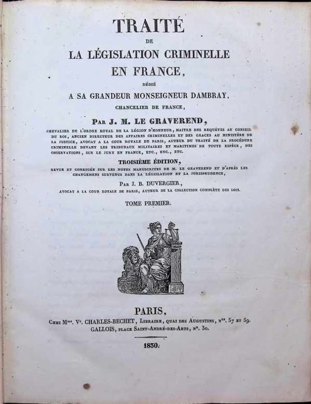 Langue: latin. Traité de la législation criminelle en France, dédié à sa grandeur Monseigneur Dambray chancelier de France, Troisième édition, revue et corrigée sur les notes manuscrites de M. Le Graverend et d'après les changements survenus dans la législation et la jurisprudence par J. B. Duvergier 2 tomes in-4, demi cuir, 719 + 819, quelques rousseurs, bon état, rare [Cette description peut avoir été traduite par une IA.]