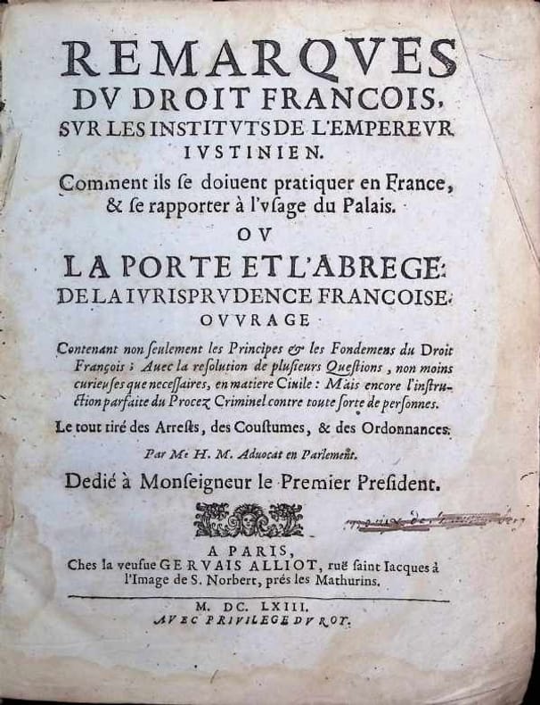 Langue: français. Remarques du droit françois sur les Instituts de l'Empereur Justinien : comment ils se doivent pratiquer en France, et se rapporter à l'usage du Palais, ou, la porte et l'abrégé de la jurisprudence française, ouvrage contenant non seulement les principes et les fondements du droit françois : avec la résolution de plusieurs questions, non moins curieuses que nécessaires en matière civile : mais encore l'instruction parfaite du procès criminel contre toute sorte de personnes : le tout tiré des arrêts, des coutumes, et des ordonnances 243 x 185 mm, 520 pp, le dos est endommagé, le bloc livre est en bon état, rare 225 x 170 mm, Plein cuir, 20 + 285 pp, bon état [Cette description peut avoir été traduite par une IA.]