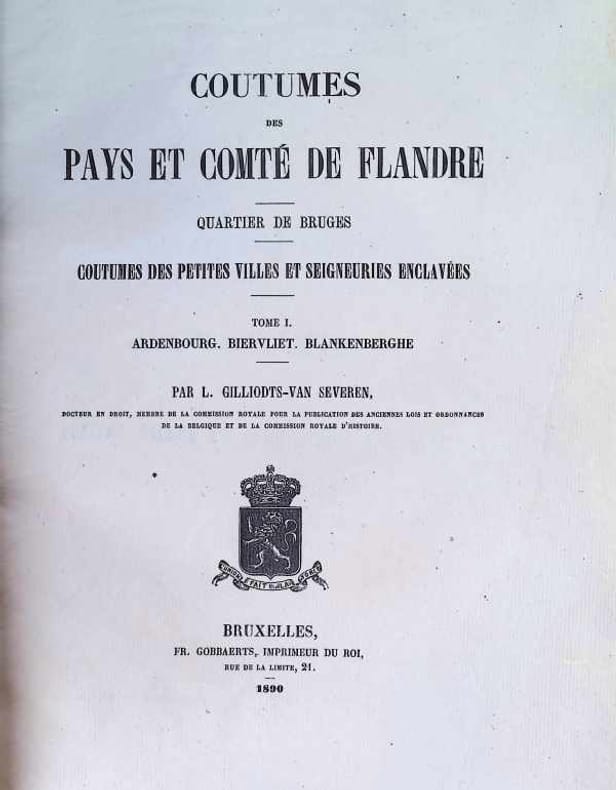 Coutumes des pays et comté de Flandre, quartier de Bruges, coutumes des petites villes et seigneuries enclavées, 6 tomes complets. Recueil des anciennes coutumes de la Belgique, Vol. 1 (1890): Ardenbourg, Biervliet, Blankenberghe (628 p.); Vol. 2 (1891): Cadsant, Caprycke, Damme, Dixmude, Eeclo (749 p.); Vol. 3 (1891): Ghistelles, Houcke, Lichtervelde, Maldeghem, Merckem, Middelbourg, Mude, Munikerede, Nieuvliet, Oostbourg (557 p.); Vol. 4 (1892): Ostende, Oudenbourg, Sluis (743 p.); Vol. 5 (1892): Sysseele, Thourout, Watervliet (524 p.); Vol. 6 (1893): Winendale, Ysendike, supplément (616 p.) 290 x 215 mm, couverture rigide uniforme, partie d'un tout plus grand : Recueil des anciennes coutumes de la Belgique, Tous les textes néerlandophones ont été traduits en français, légères traces d'utilisation sur les couvertures, le bloc livre est encore en très bon état. [Cette description peut avoir été traduite par une IA.]