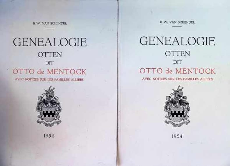 Genealogie Otten Dit Otto De Mentock avec notices sur la familles alliées, 2 Tomes Couverture souple, 325 x 245 mm, Tome 1 : 212 pp Tome 2 : 213 - 477 pp 99 planches, broché, très bon état. Exemplaire numéroté