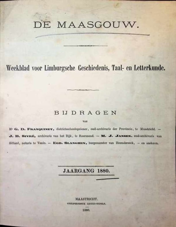 Hardcover, 29 x 21 cm, 207 blz + inhoudstafel 8 blz, 51 nummers, Nederlands, Eerste editie, staat: Zeer GoedrnHet blad verscheen voor het eerst op 2 januari 1879 als De Maasgouw. Weekblad voor Limburgsche Geschiedenis, Taal- en Letterkunde, uitgegeven door Leiter-Nypels in Maastricht. rn zeer zeldzaam