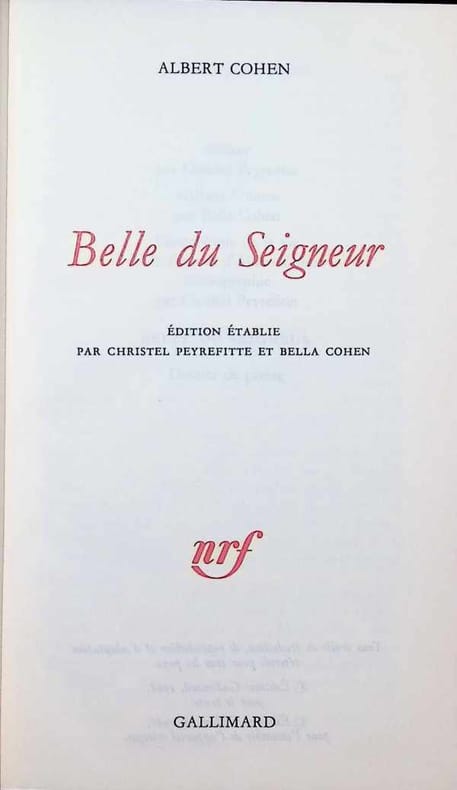 Belle du Seigneur, considéré comme l'anti-roman d'amour le plus marquant de la littérature francophone du vingtième siècle, constitue un réquisitoire sans pitié contre l'amour-passion : les héros, Solal et Ariane, étouffent dans la passion parfaite qu'ils ont imaginée et dont ils jouent le rôle. Le roman rompt un silence de quatorze ans (Le Livre de ma mère paraît en 1954) pour revenir à Solal et Mangeclous et transformer l'élan ironique des deux oeuvres publiées en 1930 et 1938 en une tragédie amoureuse qui viendra clôre la satire dans la mémoire disaporique et familiale. Belle du Seigneur en est l'élément central : « Quel morceau, Quel monstre ! 845 pages, 32 francs et à peu près autant d'heures de lecture : on est terrorisé... On tente pourtant l'aventure. On plonge dans l'énorme histoire : alors le mécanisme joue et l'on est piégé. Des beautés éclatantes, des torrents de mauvais goût : on est emporté par l'un, ébloui par les autres. On sort de là un peu stupéfait, la tête vide, mais soyons francs : le jeu en valait la chandelle». (François Nourissier, Les Nouvelles Littéraires, septembre 1968). Très bel exemplaire, tel que paru, entièrement non coupé.