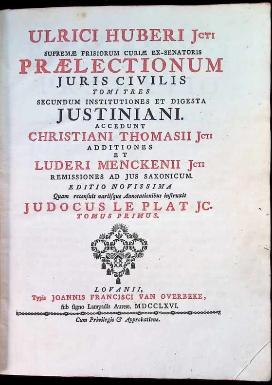 Cuir pleine fleur (reliure rigide), 26 x 19 cm, 3 volumes[20], 514 p. ; [26], 542, [2]p. ; [26], 738, [2]p. pp., Latin, état du livre : Très Bon Ulrici Huber jcti Supremae Frisiorum Curiae ex-senatoris Praelectionum juris civilis tomi tres secundum Institutiones et Digesta Justiniani. Accedunt Christiani Thomasii jcti Additiones et Luderi Menckenii jcti Remissiones ad jus Saxonicum. Editio novissima quam recensuit variisque Annotationibus instruxit Judocus Le Plat jc. Tomus primus [-tertius] 3 volumes ([20], 514 p. ; [26], 542, [2]p. ; [26], 738, [2]p.) ; in-4. Publié par Typis Joannis Francisci Van Overbeke,, Lovanii,, 1766 reliure en cuir pleine fleur, titres dorés sur le dos, dommages mineurs au cuir, charnières légèrement affaiblies, coins, le bloc livre est un exemplaire très sain, sans taches ni écriture, sans jaunissement. [Cette description peut avoir été traduite par une IA.]