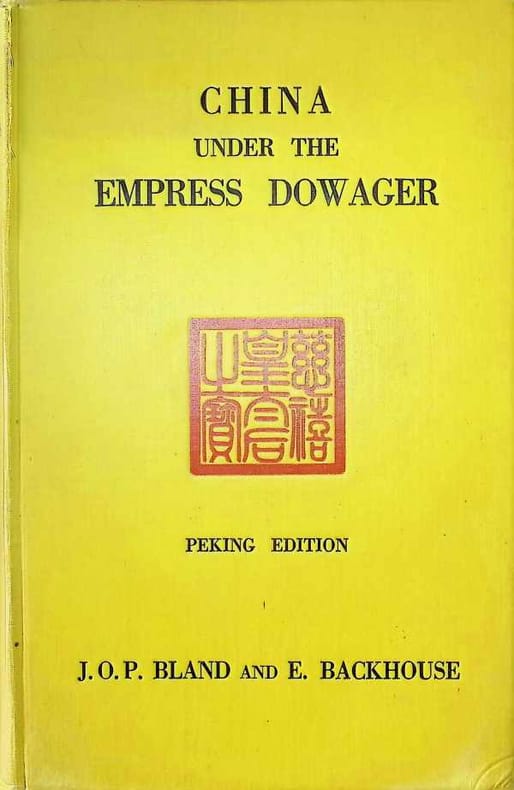 Philadelphia J. B. LIPPINCOTT COMPANY 1910 -in-8 pleine percale un volume, reliure bradel pleine percale jaune (yellow hard-back percale editor) in-octavo Editeur (25 x 16,5 cm), dos et premier plat imprimés en rouge (plaques spéciales editeur), 1ère de couverture orné d'un cachet de censure chinois en rouge, tête lisse dorée, toutes tranches lisses (smooth edges), texte en anglais, orné d'un portrait photographique en noir de l'impératrice douairière Tzu Hsi + une carte de Pékin sur deux pages en noir + 26 photographies hors-texte en noir + deux reproductions hors-texte en couleurs + un fac similé hors-texte en noir d'un fragment du journal de son excellence ching shan, quelques petites rousseurs sur la couverture et en marge parfois du texte, XVI+525 pages, 1910 Philadelphia J. B. LIPPINCOTT COMPANY, London William Heinemann Editors,