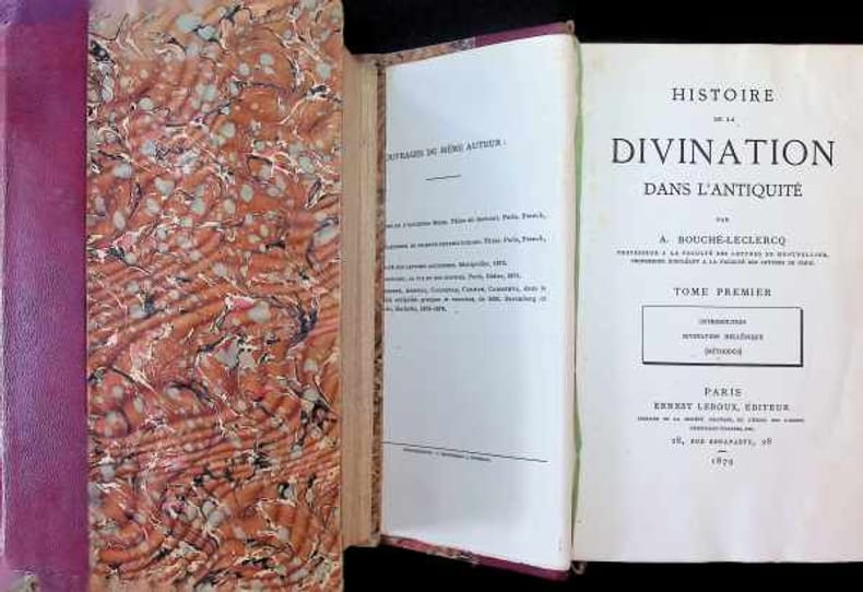 Reliure demi-cuir / demi-marbré, 25 x 17 cm, X + 380 + 409 + 416 + 403 pp., les premières pages avec un peu de rousseurs, français, 2 volumes, état du livre: Très bon Tome premier : Introduction ; Divination Hellénique; Tome deuxième : Les Sacerdoces divinatoires, Devins, Chresmologues, Sibylles, oracles des Dieux. Tome troisième : Oracles des dieux (suite), oracles des héros et des morts, oracles exotiques Hellénisés. Tome quatrième : Divination Italique, index Général. [Cette description peut avoir été traduite par une IA.]