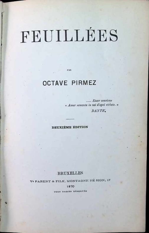 Orné d'un portrait photographique de l'auteur. Octave Pirmez (1832 - 1 mai 1883), est un écrivain, philosophe, poète et essayiste wallon d'expression française, de nationalité belge, né à Châtelineau (section de Châtelet) et décédé à Acoz. Il est le neveu de Jean et de Sylvain PirmezIl vécut une vie sans histoire au château d'Acoz, dans la province de Hainaut où il mourut. Le jeune Georges Rodenbach fut l'un des premiers à défendre son œuvre, notamment dans son premier roman l'Art en exil. Dans Souvenirs pieux (1974), Marguerite Yourcenar consacre plus de cent pages à celui qui fut son grand-oncle, figure oubliée de l’un «des pays les plus philistins de l’Europe» et tente de le réhabiliter. (wiki). !!! !!! Du 3 octobre au 24 octobre il n'y aura pas d'expédition de colis: le libraire est en voyage. La librairie reste ouverte et nous répondrons sporadiquement aux emails. Merci pour votre compréhension. ––> From 3 October to 24 October, there will be no parcel deliveries as the bookseller will be travelling. The bookshop will remain open and we will respond to emails sporadically. Thank you for your understanding.