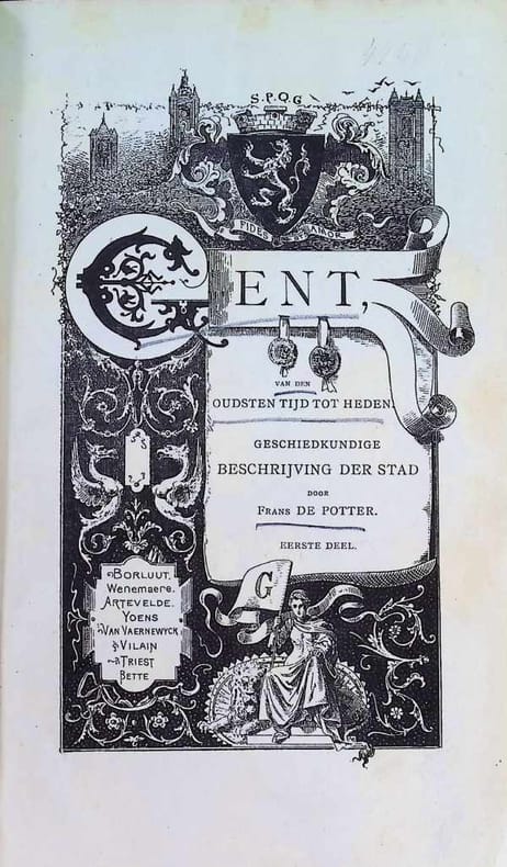 Gent, 1882-1901 7 volumes (8e deel ontbreekt)): viii,617 + iii,587 + 546 + 618 + 659 + 578 + 566 pp., met illustraties in en buiten tekst (waaronder een aantal uitvouwbare platen), originele 1882-1901-uitgave, met index in elk deel, 23cm., uniforme gecart. banden (gemarbreerde platten, linnen ruggen met titel in goudopdruk), wat roestvlekjes, in de reeks "Geschiedenis van de gemeenten der provincie Oost-Vlaanderen", mooie set van dit zeldzaam referentiewerk over Gent, het (door De Potter overigens onafgewerkte) achtste deel ontbreekt, gewicht: 7kg., B92661
