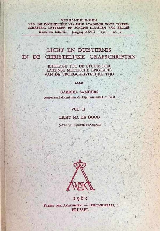 Lumière et obscurité dans les épitaphes chrétiennes, vol. I vie terrestre et lumière obscurité avant et après la mort Actes de l'Académie royale flamande des sciences, des lettres et des beaux-arts de Belgique, classe des lettres, année XXVII, n° 56 Couverture souple, 265 x 180 mm, 385 -1085 pages, illustrations en noir et blanc, très bon état [Cette description peut avoir été traduite par une IA.]