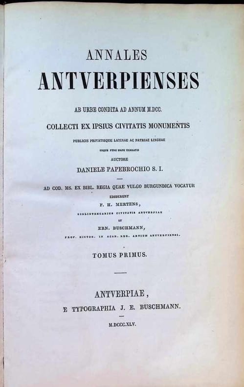 Antverpiae [Antwerpen], J.E. Buschmann 1845-1848 5 volumes (complete, all published): xvi,473 + 499 + xvi,532 + 502 + 446pp., illustrated with 3 folding plates (large folding panoramic view on Antwerp, "Turris Croneburgica" & "Vetus curia") in volume I & 2 folding plates (of which one large map of Antwerp) in volume 2 & 1 folding plate in volume 3, nice uniform 19th cy. hardcover bindings (marbled boards, spines in black leather with title and decorations in gilt, text in latin, text is clean and bright with only few occasional foxing, very good set, rare, [Papebroch, Papebrochius = Daniel Van Papenbroeck, Anvers 1628-1714, cfr. De Backer-Sommervogel VI p.182 no.12], B87732