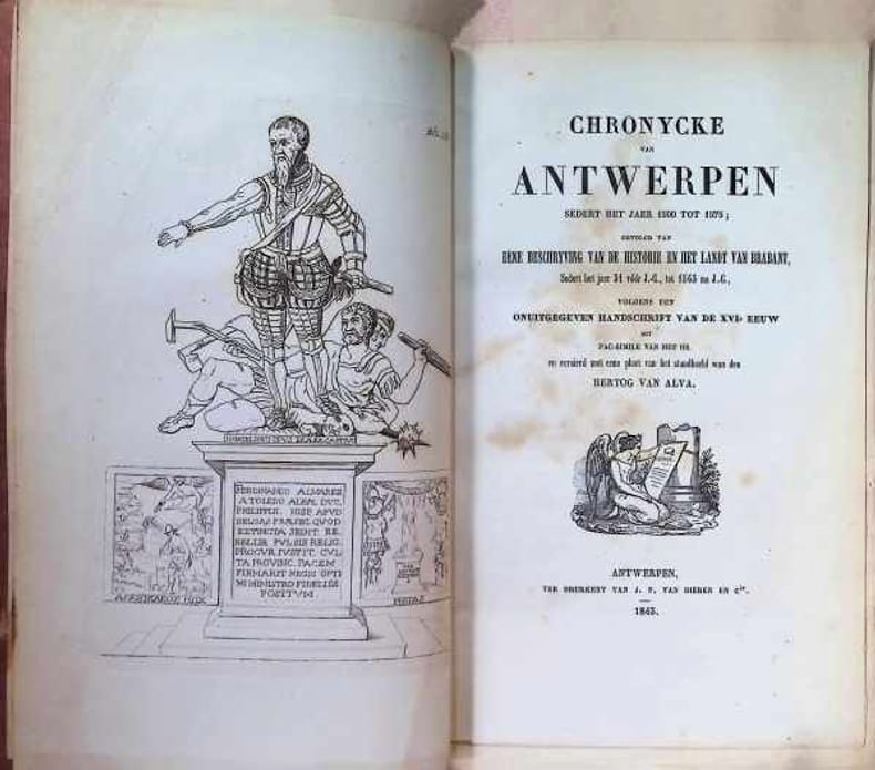 Chronique d'Anvers depuis l'année 1500 jusqu'en 1575 ; suivie d'une description de l'histoire et du pays de Brabant depuis l'an 51 avant J.C. jusqu'en 1565 après J.C. selon un manuscrit inédit du XVIe siècle avec fac-similé du manuscrit et ornée d'une plaque de la statue du duc d'Alva, 1843, couverture rigide, 23 x 15 cm, très bon état 300 pages [Cette description peut avoir été traduite par une IA.]