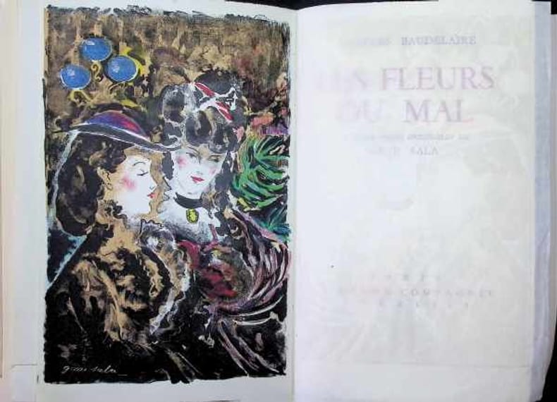Une illustration art déco des Fleurs du Mal. Un des 10 exemplaires de tête sur Japon Impérial (n° 4), agrémenté d'une aquarelle originale inédite signée intitulée « Épigraphe pour un livre condamné » et d'une suite en noir. Suivent 25 sur vélin avec un dessin original ayant servi à l'édition et une suite en noir, puis 450 exemplaires sur vélin, pour un tirage total de 485 exemplaires. Il est enrichi d'une autre aquarelle rehaussée au crayon de papier datée 1906 vraisemblablement d'une autre main, naïve, et de 3 lettres autographes signées d'André Domin à René Kieffer. Deux en 1918 au sujet de la dimension des pages pour Les Fleurs du mal ainsi que les aléas de la vie d'André Domin et une de 1930 évoquant des comptes financiers à apporter au SPAD. Il est revêtu d'une reliure éditeur à décor à la plaque à froid de fleurs inscrites dans un encadrement losangé (Sanjuan planche LI). L'édition présente 26 illustrations hors-textes au trait, colorées au pochoir avec le titre du poème au-dessous et 52 culs-de-lampes en noir. René Kieffer publie par ailleurs 100 exemplaires d'un tiré-à-part des planches de Domin. André Domin, connu pour avoir fondé avec Marcel Genevrière la maison de décoration d'Avant-garde « Dominique », exaltant la densité du matériau, fut tout d'abord illustrateur de presse et de publicité. Il participa pour les éditions Kieffer à deux ouvrages, Litanies de la Rose de Remy de Gourmont publié en 1919 (Sanjuan p. 666) et Les fleurs du mal de Baudelaire en 1920. Dans un style résolument Art déco, Domin n'hésite pas à moderniser son trait, pour au possible le dépouiller. Recueil de poèmes des plus célèbres, Les fleurs du mal est, dès le début du XXe siècle, un incontournable pour l'édition de luxe. Malgré procès et censure, il est ce jour considéré comme une oeuvre capitale de la poésie moderne. Monod 1075 ; Sanjuan 19 (planches I, II). Dos insolé, quelques légères traces violettes marginales aux pp. 186-187