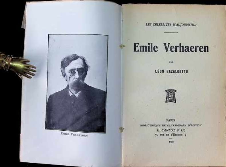 Reliés ensemble 5 ouvrages sur Emile Verhaeren 19 x 13 cm, demi toile bleu à coins, dos lisse orné, titre doré, toutes les couvertures sont conservées : - Ramaekers Georges. Émile Verhaeren. Bruxelles, Éditions de La Lutte, 1900. 37 pages. - Doutrepont Georges. Les débuts littéraires d'Émile Verhaeren à Louvain. Frontispice par Henri Gros. Bruxelles, Paris, Lille, Aux Cahiers de l'Amitié de France et de Flandre, 1919. 75 pages. - Bouglé C. Verhaeren. Conférence donnée à l'Institut Thiers par le Comité "L'Effort de la France et de ses Alliés". Paris, Bloud et Gay, 'sans date. 96 pages. - Wuilbaut Télesphore. Emile Verhaeren. Mons, Imprimerie La Province, 1926. 76 pages. - Goffin Arnold. Emille Verhaeren. Turnhout, Établissements Brepols, sans date, 35 pages. Bon exemplaire.