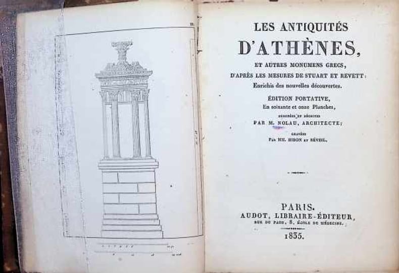 Reliure en cuir pleine ( peu abîmé ), 15 x 12 cm, 62 + LXX des. pp., français, 1ère édition, illustrations ; soixante et onze planches dessinées et décrites par M. Nolau, architecte, état du livre: Très bon.